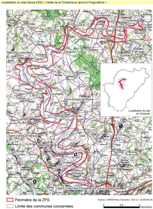 Le site Natura 2000 "Vallée de la Charente en amont d'Angoulême" se compose de tout le linéaire et d'une partie du lit majeur de la Charente depuis Mouton jusqu'aux étangs de St Yriex sur Charente.